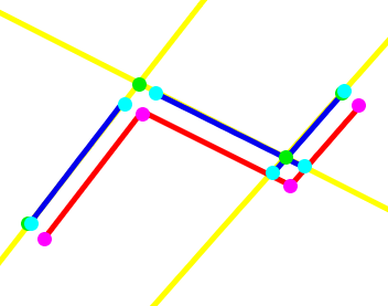 - Cast rays (yellow lines) between these new points and find the intersection points of the rays (green points)