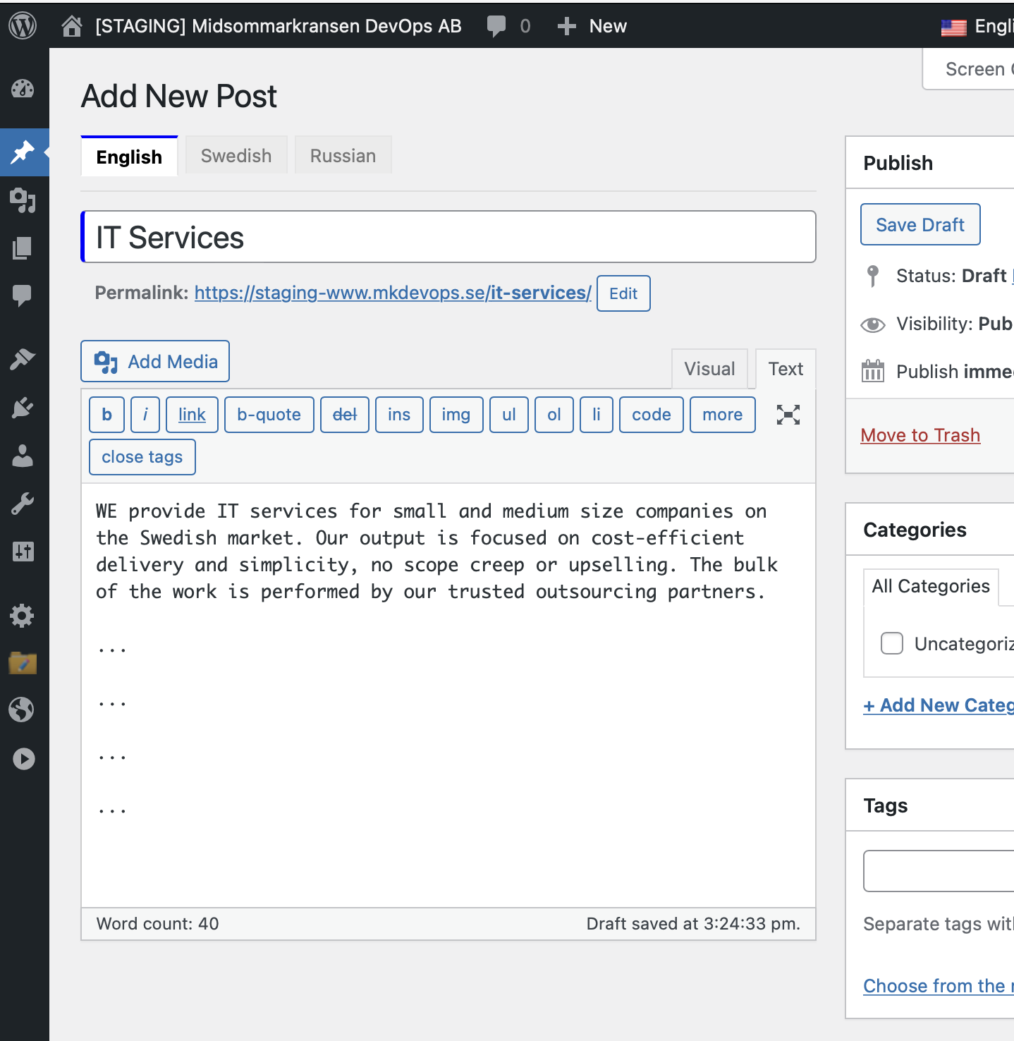There should be two WordPress "pages" with translations, and these should be the text source for the two different views on the page, in Swedish and English.