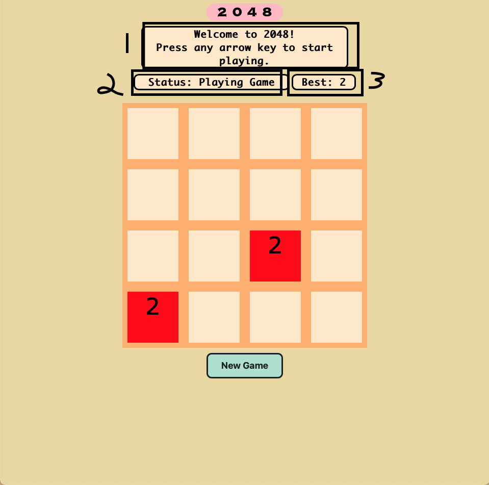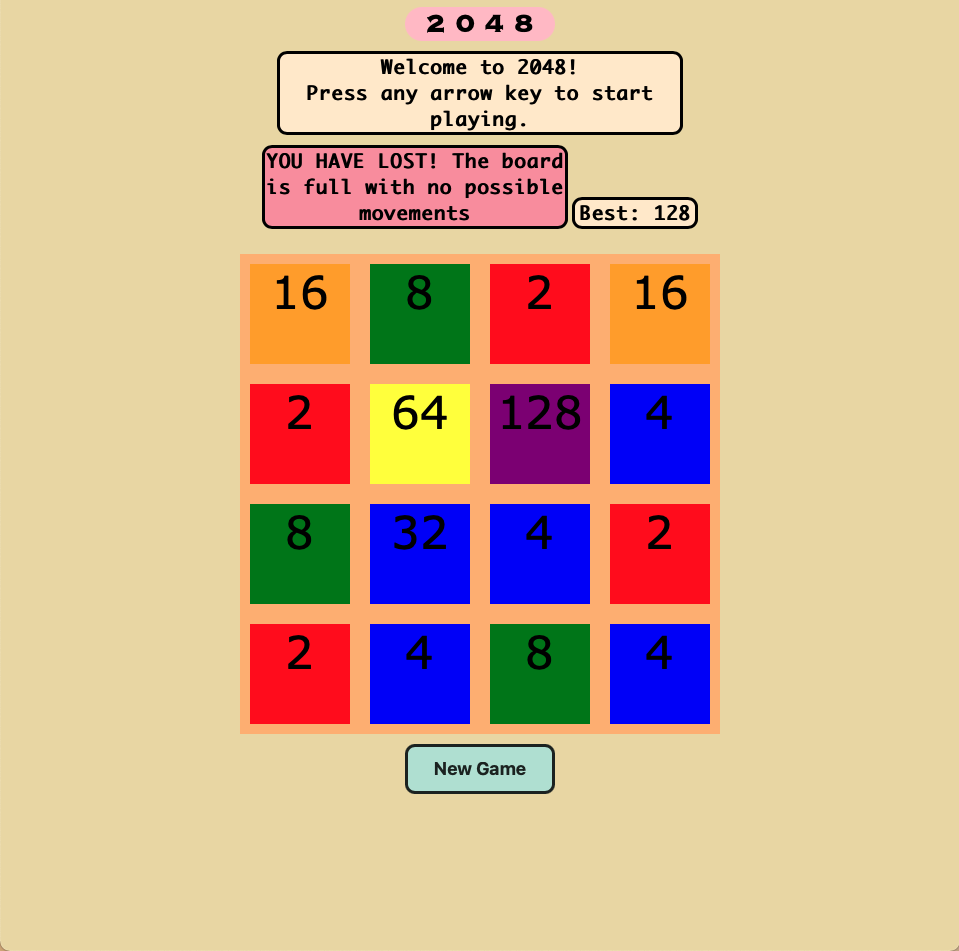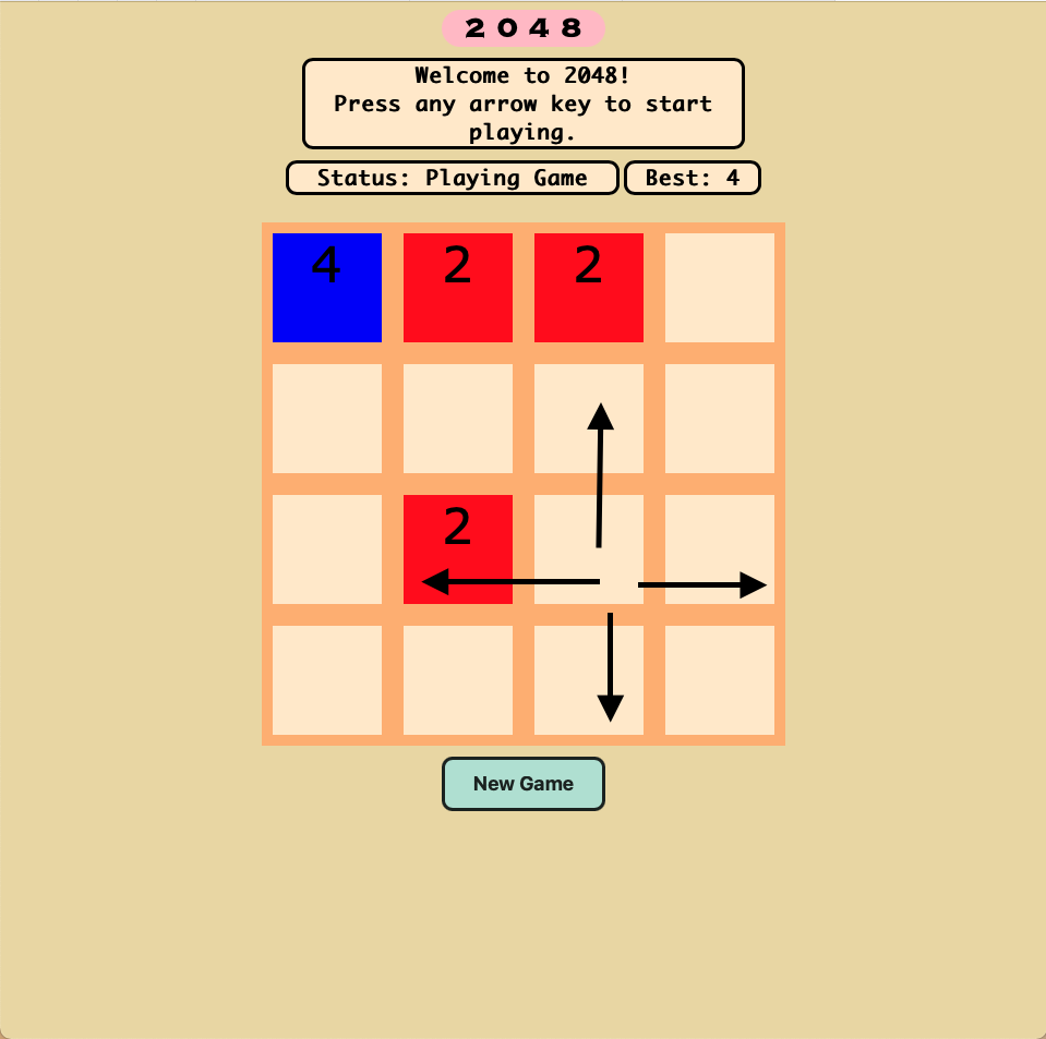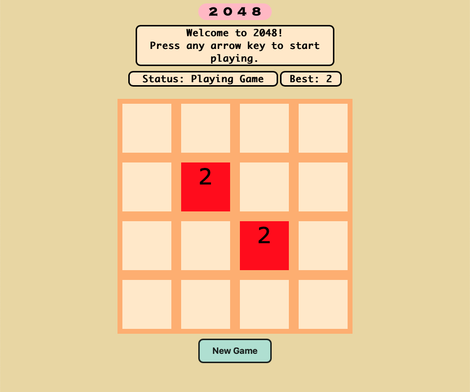 The game will start off with a 4x4 grid game board of tiles (16 tiles in total), with 2 tiles of value 2 being randomly placed on the board. The game will be ready to go once you open the link.