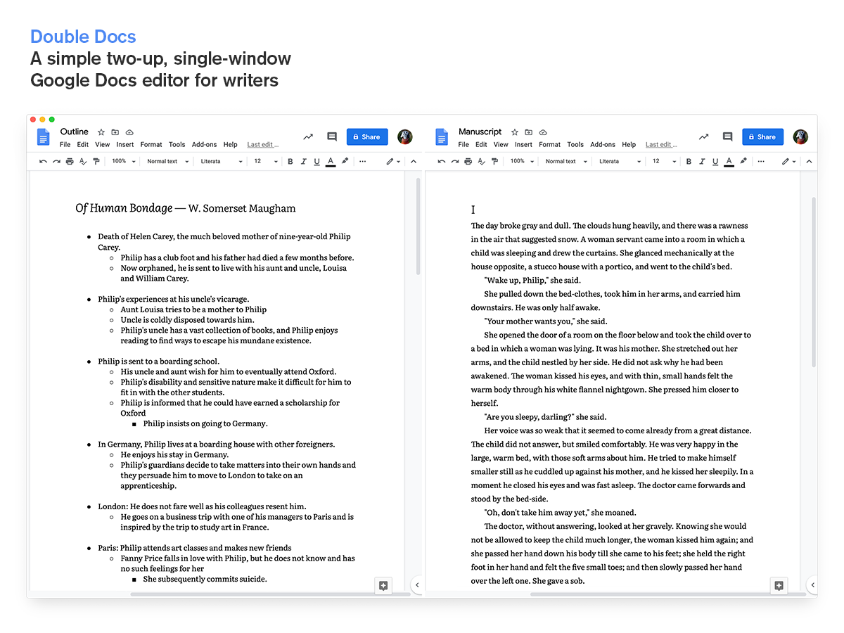 Double Docs is a simple two-up, single-window Google Docs editor for writers built in Electron.
