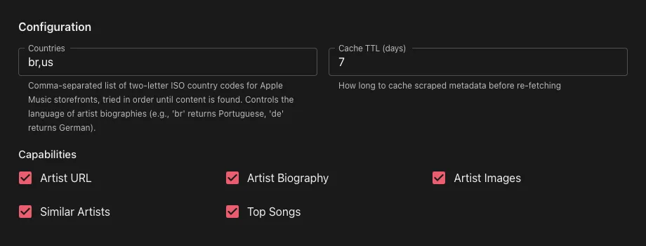 This plugin fetches artist and album metadata from Apple Music using free iTunes/Apple Music endpoints — no API key or authentication required. It provides artist biographies, images, similar artists, top songs, album artwork, and album editorial notes by scraping Apple Music web pages and querying the iTunes Search/Lookup APIs.