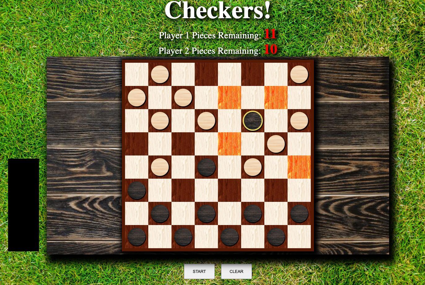 This image shows pieces placed on the board. Notice the left side, the black/white box indicates which player's turn it currently is. Also notice the highlighted tiles, showing the valid moves of the selected piece (king in this case).