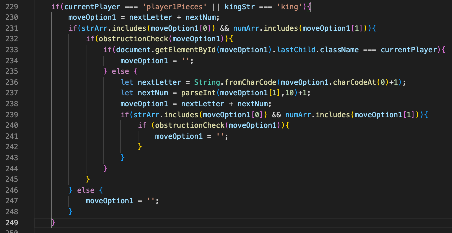 The code snippet below displays one fourth of the next valid move function. This section was especially difficult as it had to check if the next space exists on the board, if an obstacle (player piece) occurs, if the next space beyond an obstacle exists, and again if there is an obstacle at this new spot. Additionally, it needs to account for both standard pieces while allowing "king'd" pieces to move as expected.