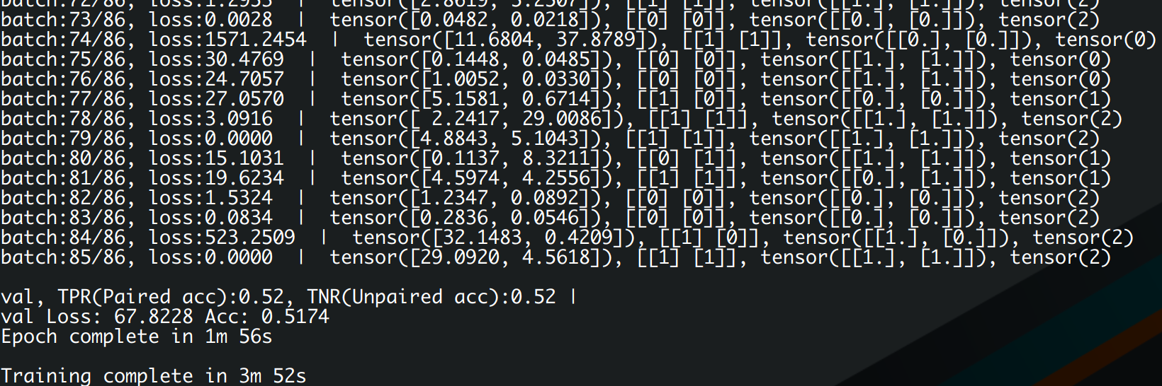 python train.py --model SiameseResNet --data aug --margin 4 --lr 3e-4 --step 10 --nepoch 50 --batch_size 4For evaluation, please run:python evaluate.py --model SiameseResNet --margin 4 --weight [modelname].pth -