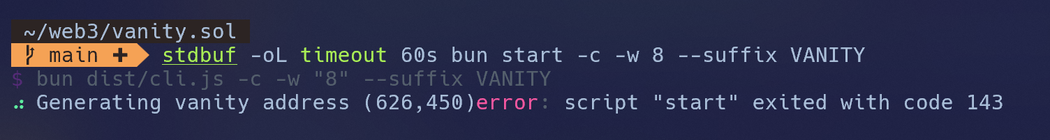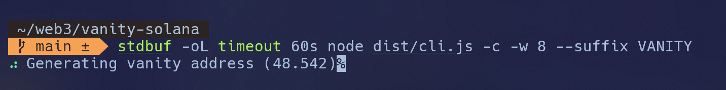 vanity-solana -w 1Most Solana apps will truncate your address, only showing the first and last 4 characters of your address, so it is not recommended to use longer strings than 4 characters.