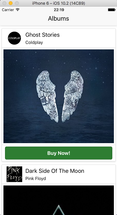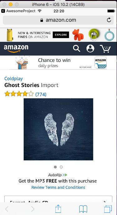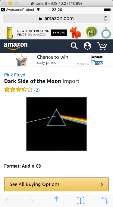 My first app using React Native, scrollable albums, use JSON to fetch album data from amazon and images from imgur. After clicking "buy now" button amazon website opens in a browser.