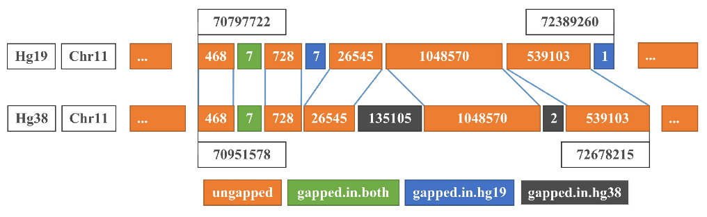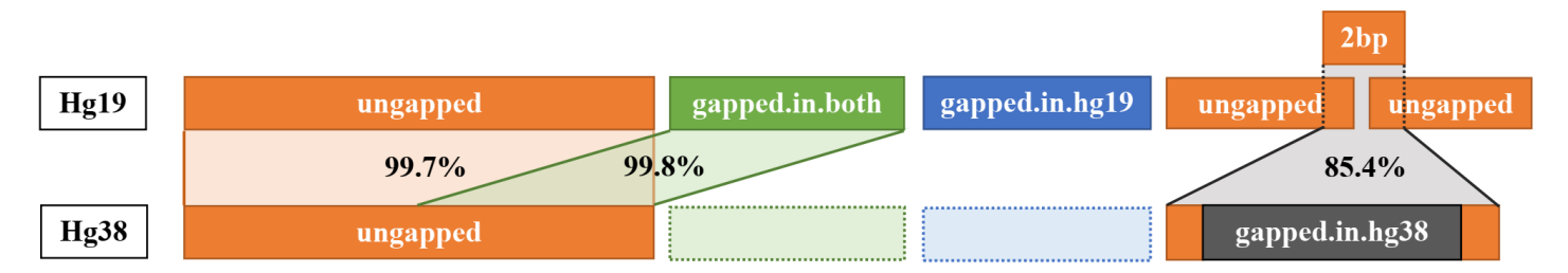 The coordination of gapped-in-hg19, gapped-in-both, gap in hg38 and ungap