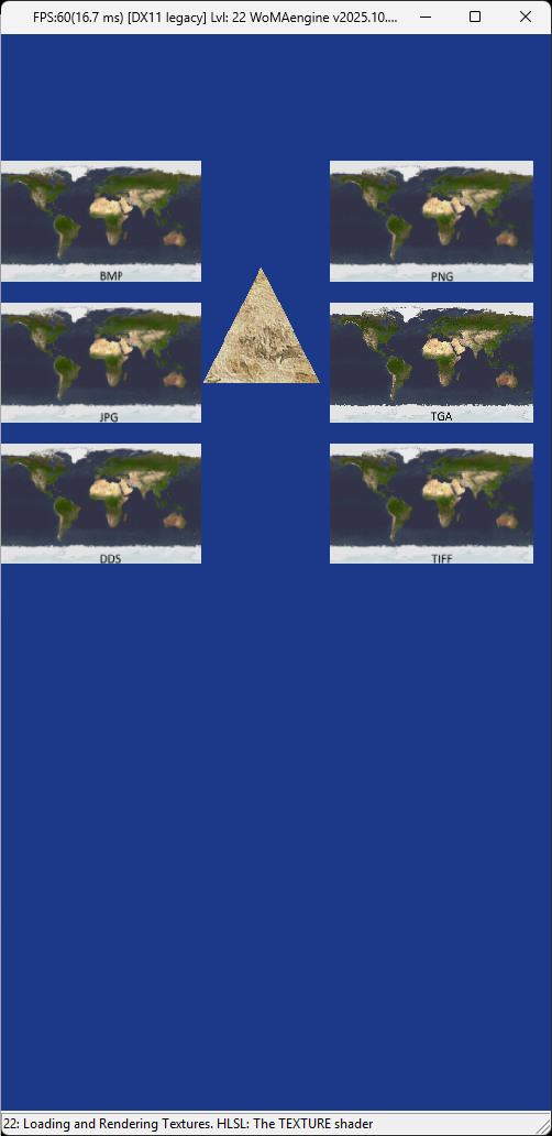 - Load multiple texture formats (BMP, PNG, JPG, TGA, DDS, TIFF)