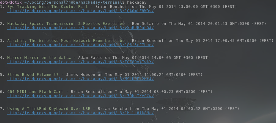 sudo npm install -g hackadayAfter installation just type hackaday and you'll see latest posts into your terminal.