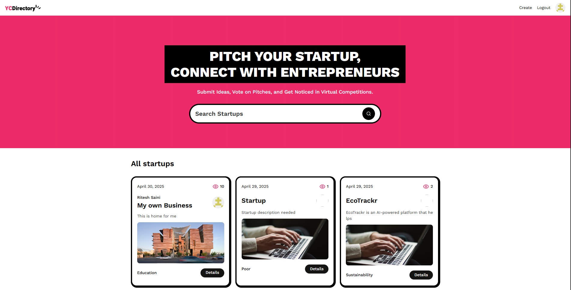 A modern full-stack startup listing platform built with Next.js, Sanity.io, and TypeScript. Users can discover startups, search in real-time, submit their own ventures, and authors can manage entries through an authenticated dashboard.