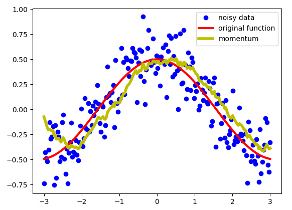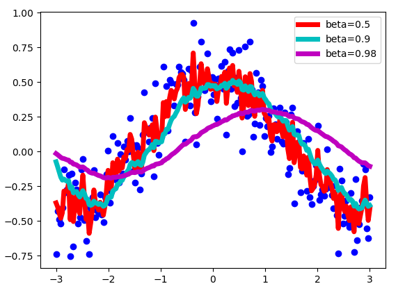 As you can see, with smaller numbers of beta, the new sequence turns out to be fluctuating a lot, because we’re averaging over smaller number of examples and therefore are ‘closer’ to the noisy data. With bigger values of beta, like beta=0.98, we get much smother curve, but it’s a little bit shifted to the right, because we average over larger number of example(around 50 for beta=0.98). Beta = 0.9 provides a good balance between these two extremes.