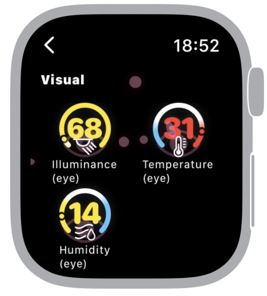 Home tab : receive data from the iOS app via WatchConnectivity, Tap the 4 IEQ dimensions to detailed data.