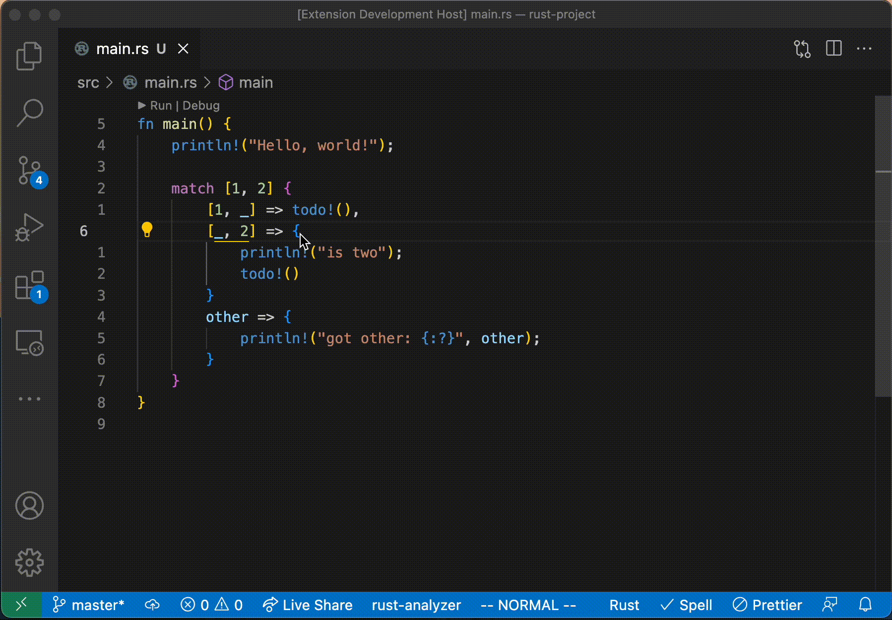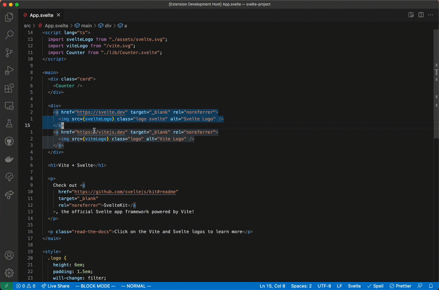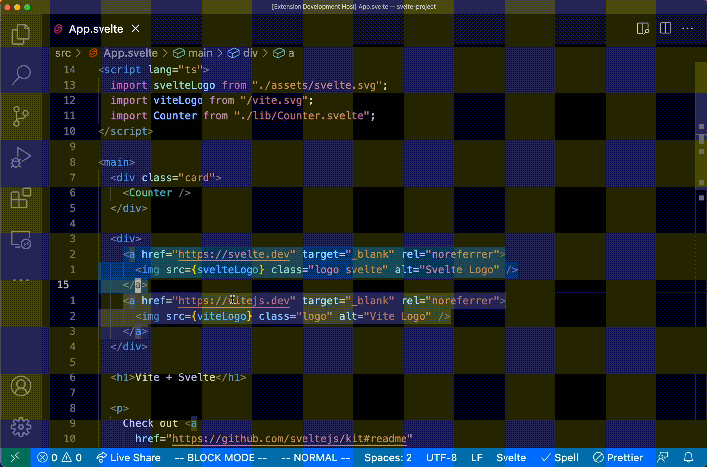 codeBlocks.colors.enabled: Whether Block Mode should color selections or not. Defaults tofalse.codeBlocks.colors.sibling: CSS string for sibling selection background color. Defaults tovar(--vscode-editor-selectionHighlightBackground).codeBlocks.colors.parent: CSS string for parent selection background color. Defaults tovar(--vscode-editor-linkedEditingBackground).