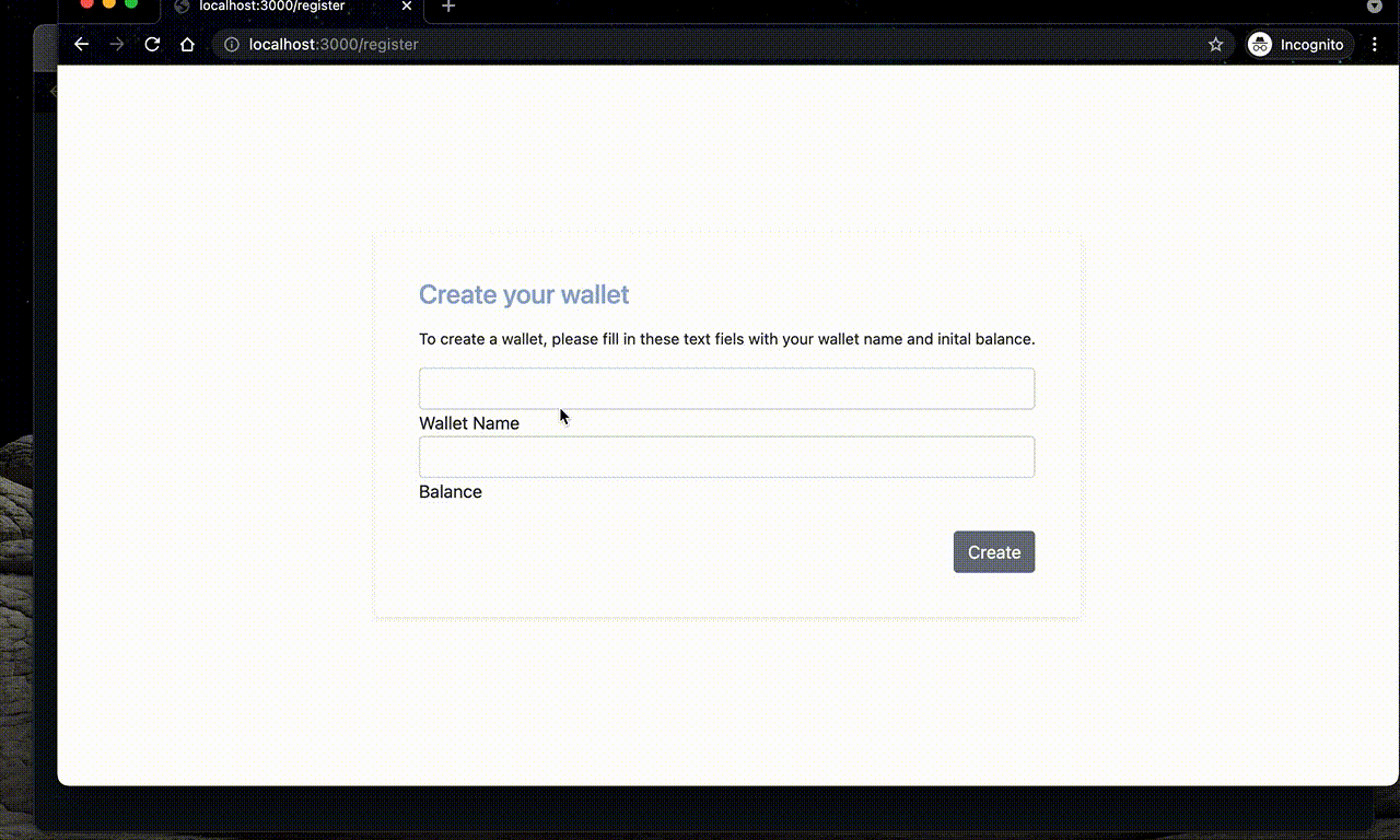 $ node bin/www //to launch the web serverYou can also edit the config.json file to run the application on different port or to give the mongodb connection uri. Default port for the server is 3000 and mongodb connection uri is mongodb://localhost:27017/wallet