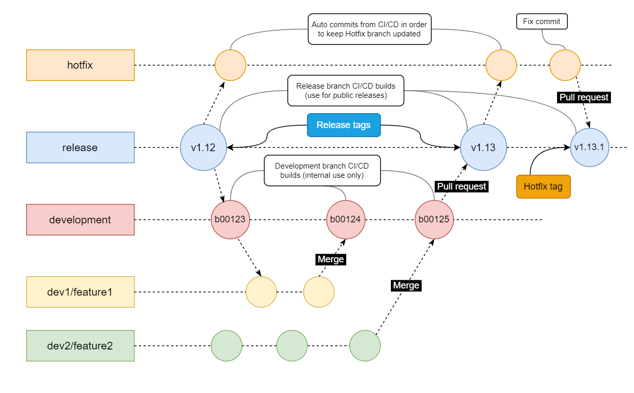 - Auto CI/CD builds of the 'development' branch should be used internally;