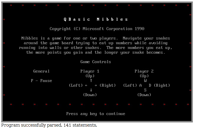 WARNING WARNING I only implemented enough of the language to run NIBBLES.BAS! It probably won't run your program and my parser makes it difficult to debug what is wrong. I think it would take several years of effort to do the whole language. This is not worth mine or anybody's effort, since you can run the real QBASIC in a javascript dosbox emulator these days... (for example https://js-dos.com/)