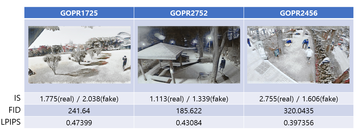 그리고 이렇게 생성된 데이터셋들을 바탕으로 YOLOv5를 학습시켰다. 총 세 가지에 대해서 학습을 시켰는데, vfp290k만 학습시킨 것, winter vfp290k만 학습시킨 것, 그리고 두 종류의 데이터를 섞어서 학습시킨 것이다. 학습시킨 데이터 셋과 다른 데이터를 이용해 성능을 측정했을 때, 성능이 안 좋았지만, 두 데이터를 함께 학습시킨 모델에서 성능향상을 보였다.