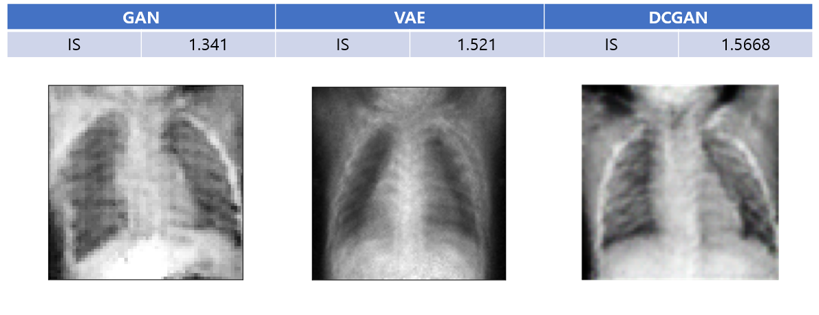 Kaggle에서 제공해주는 데이터셋인 chest X-ray 이미지를 가지고 총 1341장을 사용해 흉부 x선 이미지를 학습시켰다. 모델은 세 가지 생성모델인, GAN, DCGAN, VAE를 사용하였다. 학습 이후 30장의 X-ray 이미지를 생성한 후 IS를 측정해보았다. DCGAN이 성능이 가장 좋았으며 VAE는 아무래도 autoencoder를 사용하다보니 생성된 사진이 흐릿한 경향이 있었다.