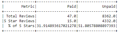 - Definitive conclusions should not be made using this dataset as the sample size of 47 Paid Reviews is not sufficiently large
