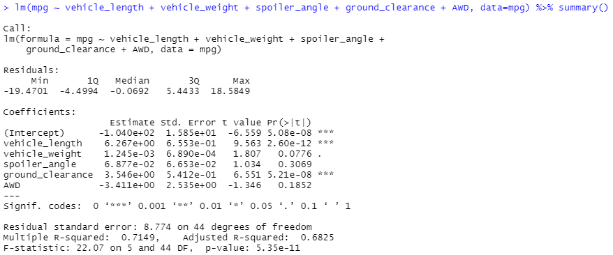 Variable Slope vehicle_length -1.04e+02 vehicle_weight 6.27 spoiler_angle 6.88e-02 ground_clearance 3.55 AWD -3.41 - Overall results of this linear model: the multi-variable linear regression model can be uysed to predict mpg of MechaCar prototypes. Although the results may not provide precise errors, the Multiuple R-squared value of 0.71, Adjusted R-squared value of 0.68, and p-value of 5.35e-11 is sufficiently high.