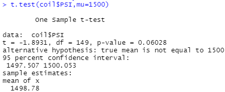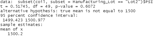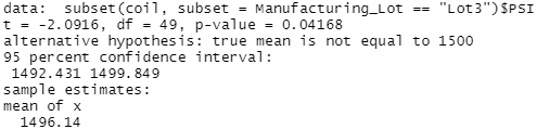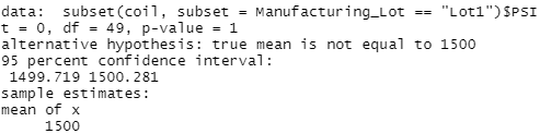 The manufacturer specifies the coils have a nominal value of 1,500 PSI. Performing a t-test across all manufacturing lots shows a p-value of 0.06, or in otherwords, the coils have a 6% chance of not being within this nominal value. As the general rule of thumb for statistcal conclusions requires a p-value of 0.05, it can be said that the manufacturing lots have a slight statistical difference from the population mean of 1500 PSI. Full results: