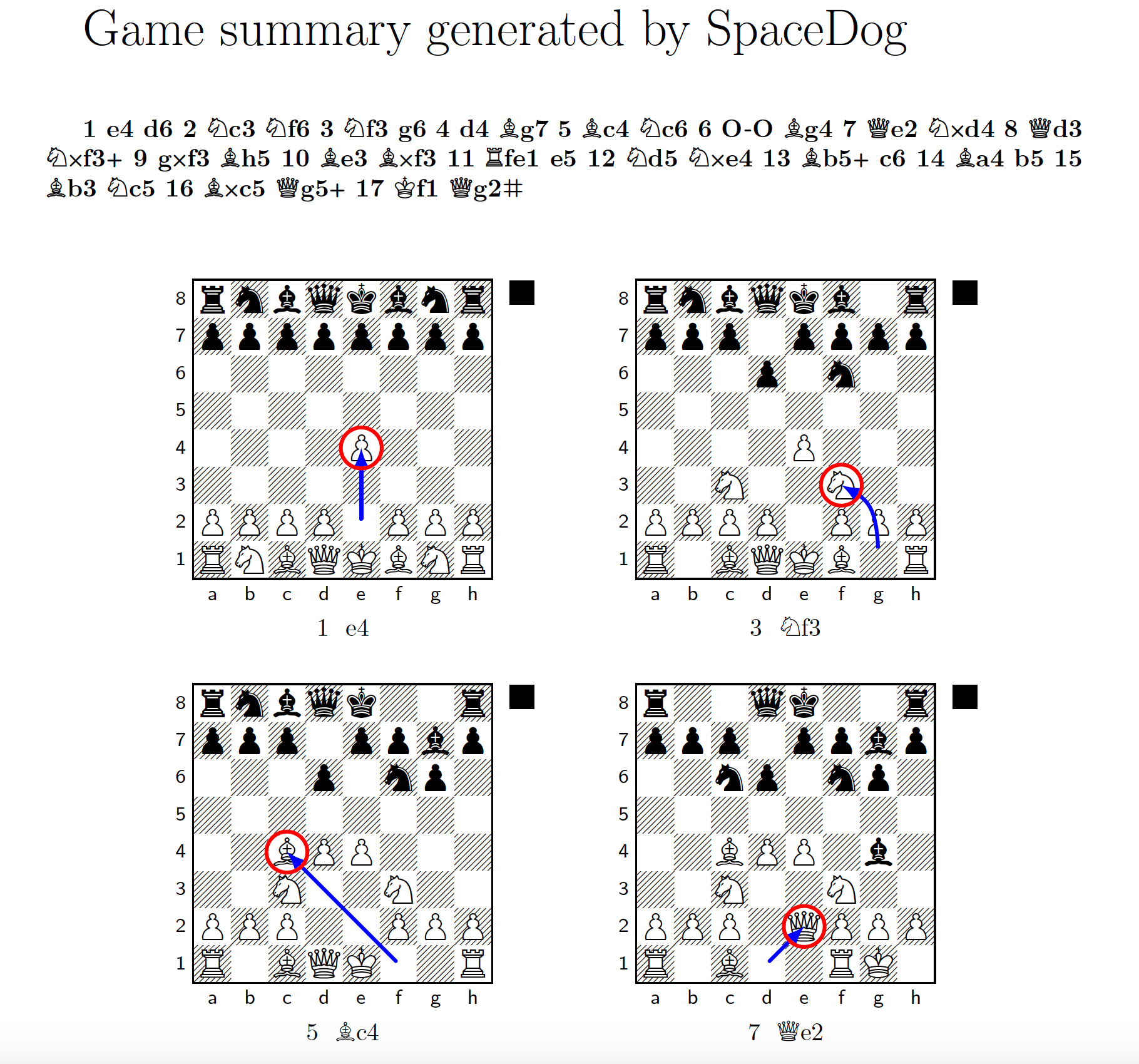 Not only that, I also used the LaTeX package xskak to create a template for a lovely game summary. This creates a TeX file with your complete PGN record inside, which when rendered will loop through the moves and output a diagram every 4 plies, including arrows and circles to show off the last move in the diagrammed position. Not to worry, the first and last moves are always shown. Sample screenshot:
