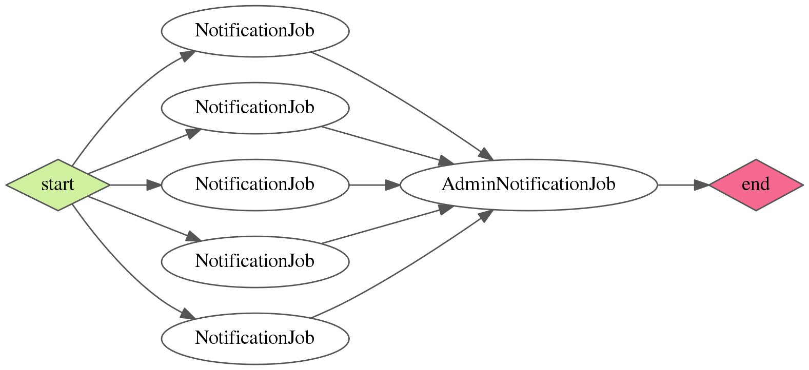 flow = NotifyWorkflow.create([54, 21, 24, 154, 65]) # 5 user ids as an argumentit will generate a workflow with 5 NotificationJobs and one AdminNotificationJob which will depend on all of them: