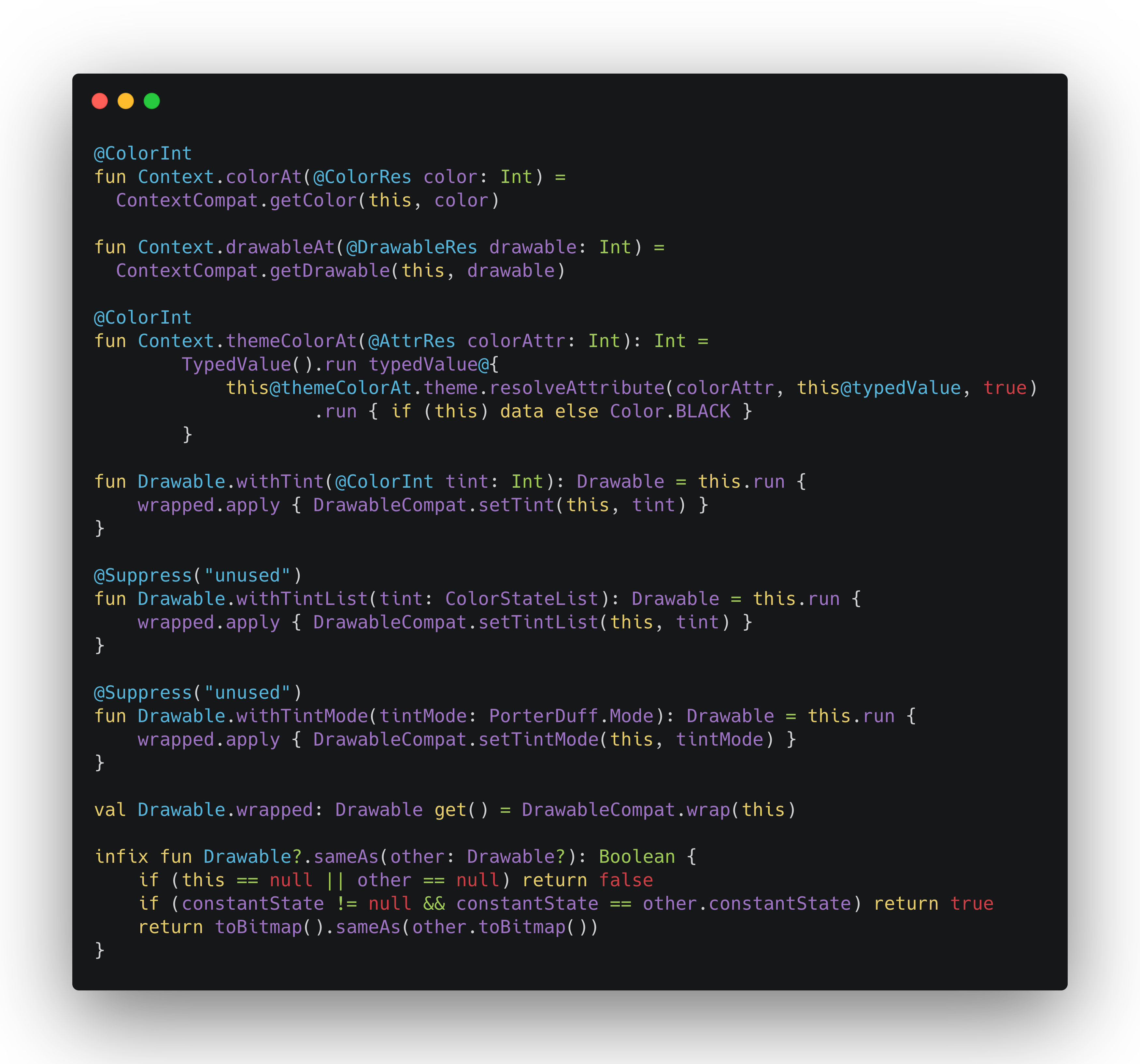| 2 | A few added utilities to the core Android KTX libraries. Includes extension methods on objects to side step ContextCompat, DrawableCompat, and a fluent SpannableString API | ![]() |