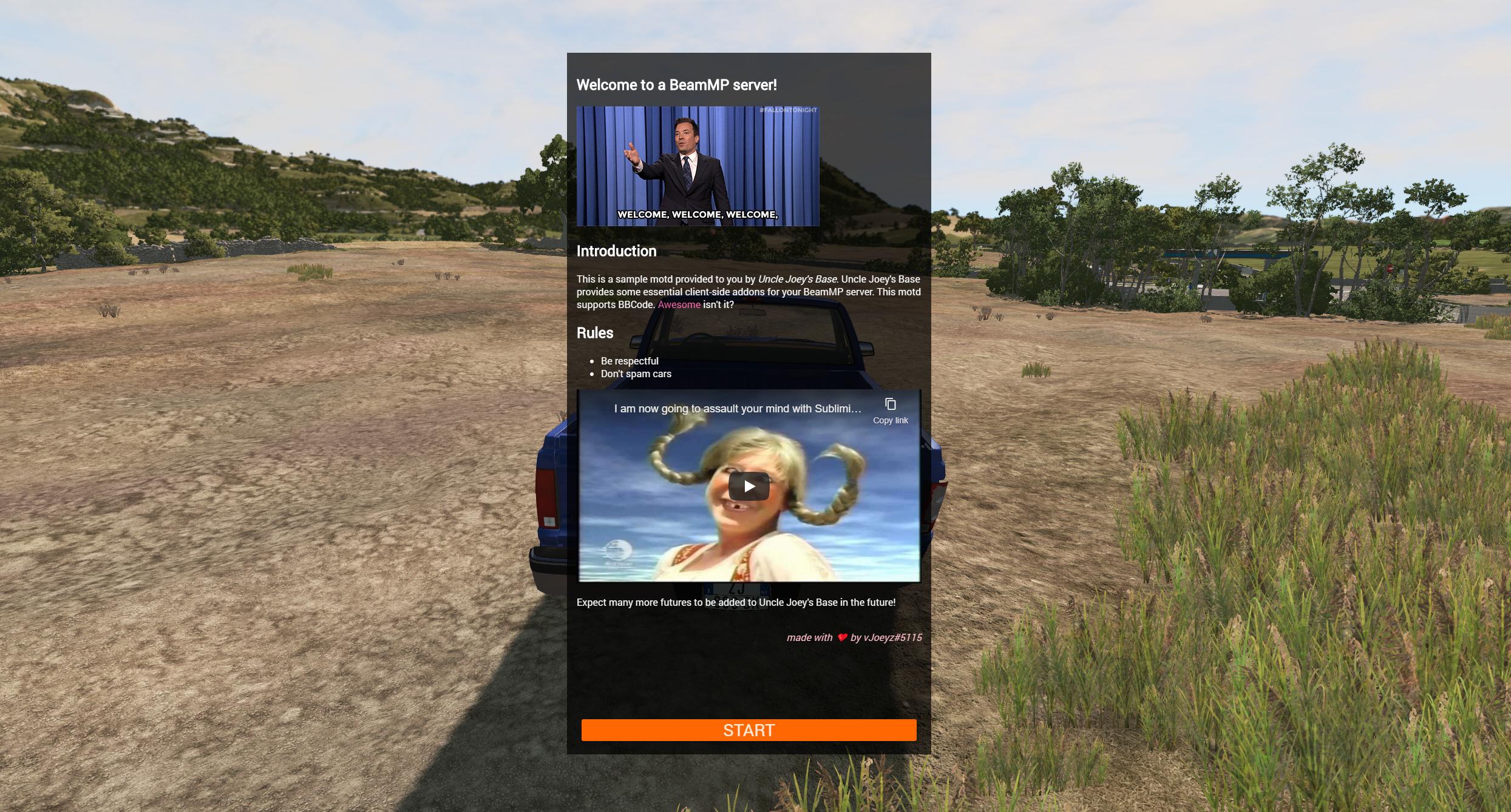 Uncle Joey's Base provides some essential client-side addons for your BeamMP server, including: