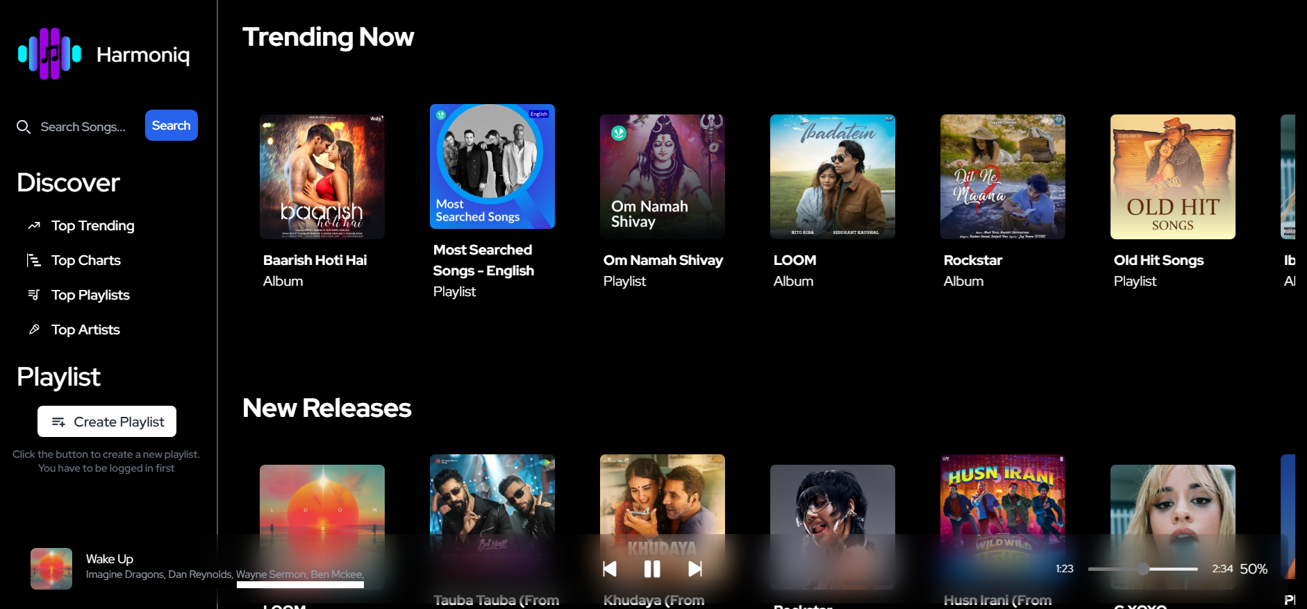 Welcome to Harmoniq, a sleek and modern music streaming app built with React.js and Tailwind CSS. Dive into a seamless musical experience powered by the JioSaavn API.