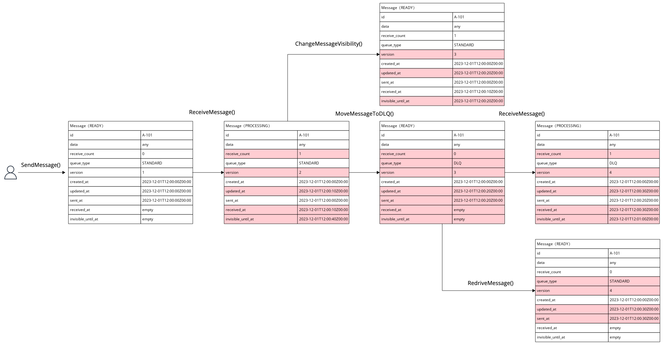 Additionally, the below diagram illustrates how message attributes change with state transitions. Attributes highlighted in red are updated during these transitions.