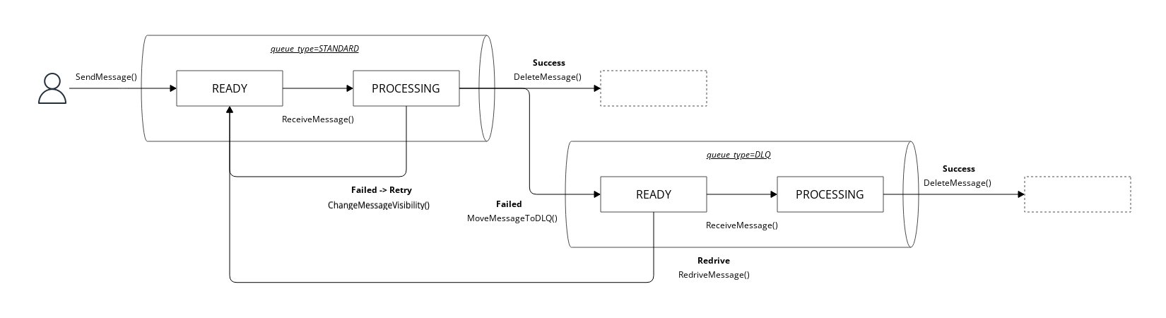 ReceiveMessage()and transitions to the 'PROCESSING' state. - During this period, the message becomes invisible to other consumers.