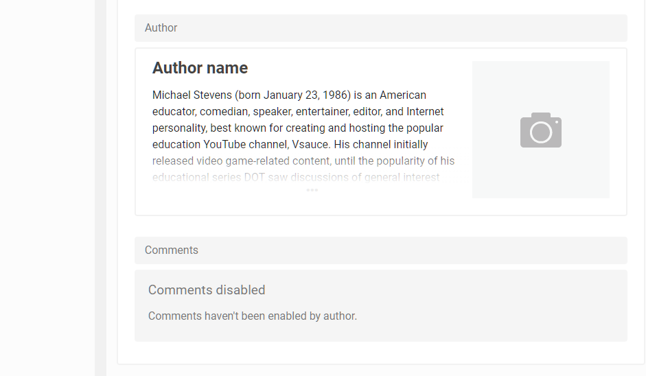 Нужно добавить тикет автора перед комментариями. UI тикета такой же как и остальных. Над ним нужен бредкрамп "Author". Картинка должна браться с первого кавера профиля. Если ее нет, то использовать https://default.wrioos.com/img/no-photo-200x200.png