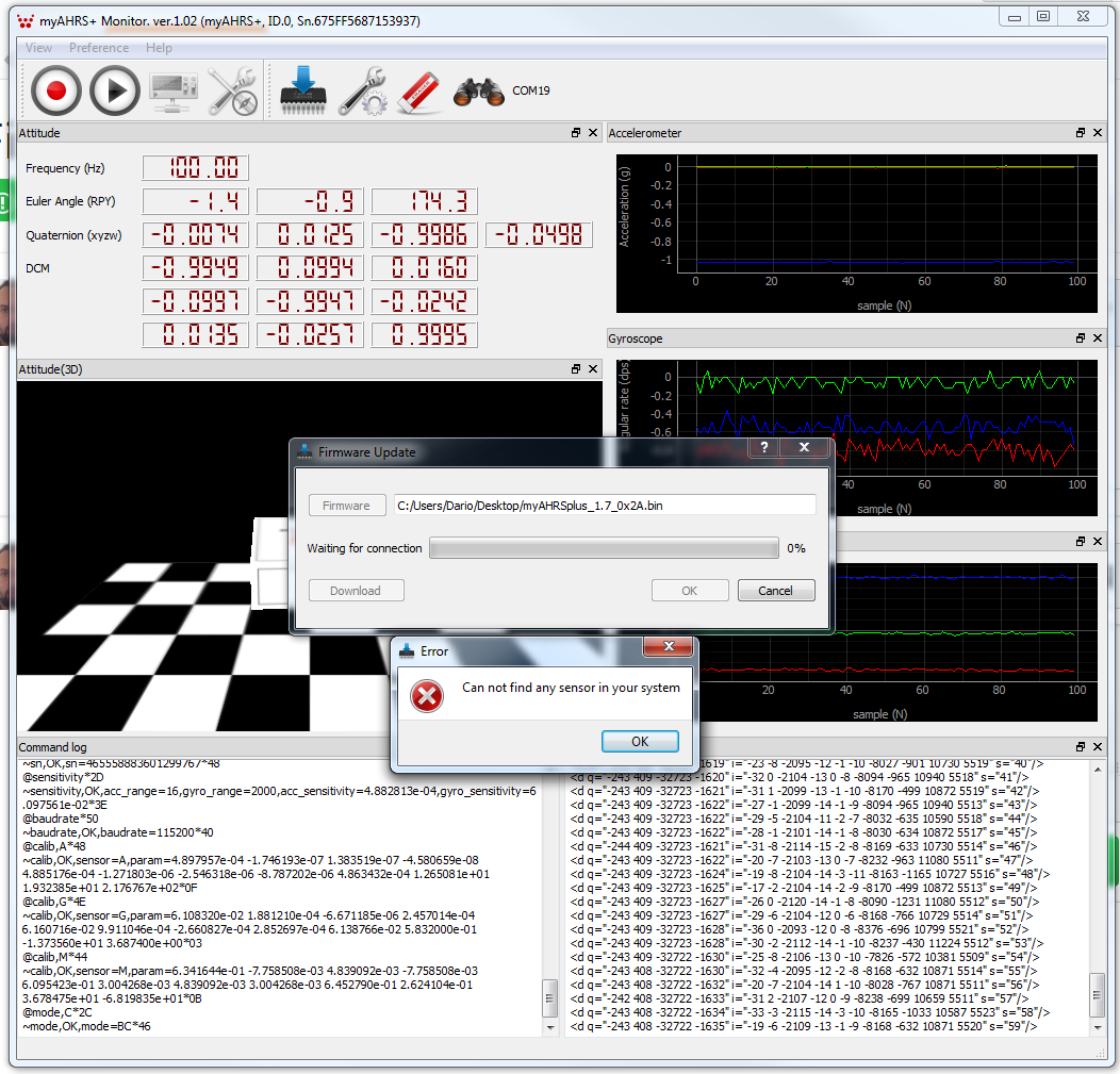 I have an MyAhrs+ with fw version 1.6 i would like to upgrade to 1.7, i open the monito, i connect the unit and all works, i press disconnect button and start firmware update, select bin file press donwload and the after waiting the software says cannot fine any sensor in your system.