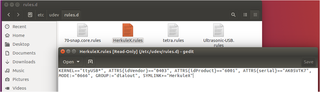 ‘HerkuleX.rules’ 파일을 ‘/etc/udev/rules.d’ 경로에 생성한 후에 해당 파일의 내용을 아래와 같이 작성한 후 저장한다.