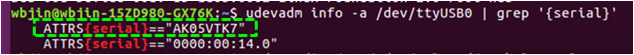 $ udevadm info -a /dev/ttyUSB0 | grep '{serial}'