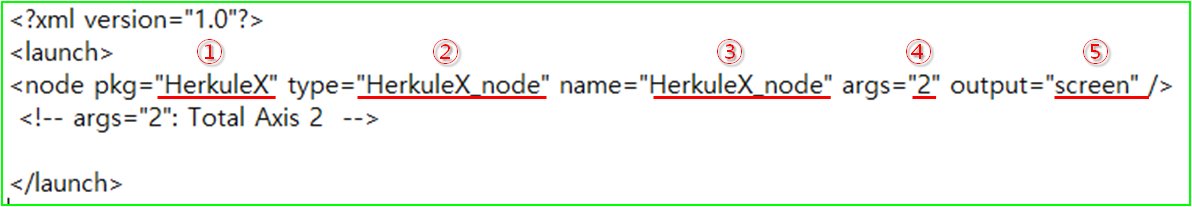 ROS시스템에서는 실행하고자 하는 ROS Node를 구동하기 위해서는 초기에 ROS마스터를 실행해 주어야 각각의 Node사이에 연결과 메시지의 통신이 가능하다. HerkuleX Package에서는 이러한 번거로움을 해결하고자 Launch파일을 추가로 제작하였으며, 이 Launch만을 실행 함으로서 HerkuleX의 구동을 할 수 있도록 되어 있다. 해당 Launch file의 구성은 다음과 같다.