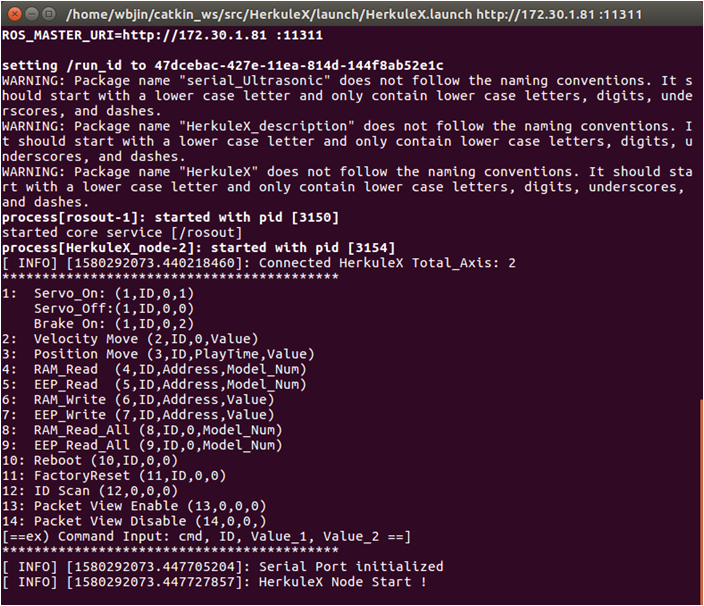 - HerkuleX Launch file이 실행되면, 아래 그림과 같이 터미널 창에 HerkuleX의 동작을 위한 입력 창이 출력된다. 이때, HerkuleX와 PC간에 Serial통신이 정상적으로 수행되면 터미널창의 가장 하단에 ‘Serial Port initialized’라는 문구가 나오게 되는데 해당 문구가 출력되지 않으면, PC와 HerkuleX간에 연결이 정상적으로 되지 않는 것이다. (해당 경우에는 HerkuleX를 연결하는 USB to Serial의 연결 및 PC에서의 인식여부, HerkuleX에 공급되는 전원에 이상이 없는지 여부를 체크해야 한다.)