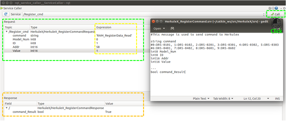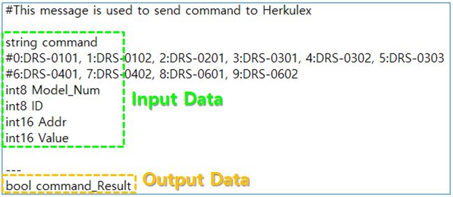 - HerkuleX_RegisterCommand.srv: HerkuleX의 EEP & RAM Register에 해당 주소번지 별 데이터를 입력하여 Read/Write기능을 수행할 수 있는 서비스에 대한 정의.