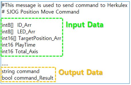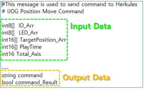 - IJOGcmd.srv: 해당 기능에서는 HerkuleX의 IJOG명령어를 이용하여, 여러 개의 HerkuleX에 속도 지정이 개별로 지정하여 동시에 위치제어가능.