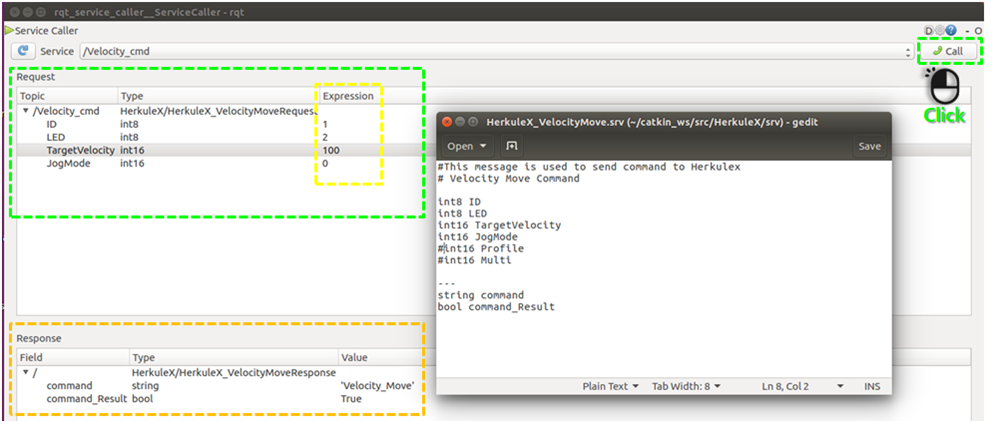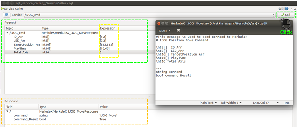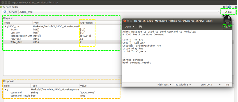 위의 그림과 같이 연결된 각각의 HerkuleX ID와 LED색상, 목표위치, 동작 시간을 배열로 입력하고, 연결된 HerkuleX의 총 개수를 입력한 후 서비스를 호출하면, 호출된 Command의 문자열과 호출의 결과가 리턴 된다.