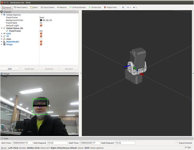 ‘HerkuleX_Pantilt_facetracking.launch’는 공개 패키지인 ‘usb_cam’과 ‘simple_face_detection’를 활용하였으며, 해당 내용은 launch파일에 정의되어 있습니다.