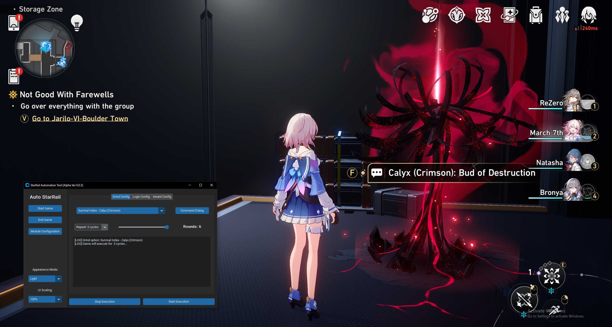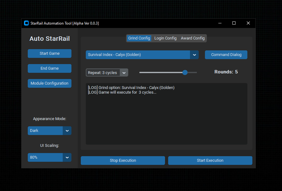 The user-interface is the main source for controlling all operations supported by starrail (auto resource grind, daily login, etc.). The UI is designed to hover on top of the game as shown below, providing easy access and control over different operations supported by the module.